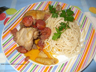 Também costumo juntar chouriço ao frango e gosto imenso :)