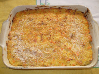 - Dispõe-se o preparado num recipiente de ir ao forno, alisa-se e polvilha-se com pão ralado.