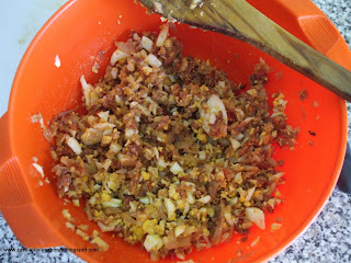 - Quando os miúdos das lulas já estiverem bem apurados e tenros, retiram-se do tacho com uma escumadeira e picam-se na picadora (carregue só 1 ou 2 vezes, para não ficar muito miúdo. Convém que fique em pedacinhos). Deite para uma tigela o preparado e faça o mesmo com os ovos cozidos. Junte-os ao preparado anterior e misture.