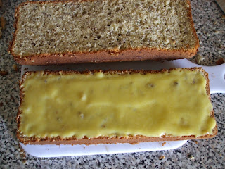 - Corta-se o bolo em 2 partes. Recheia-se com o doce de ovos. Tapa-se com a outra metade do bolo.