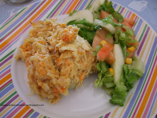 - Agora, eu envolvi o bechamel todo no bacalhau e coloquei num pirex, polvilhei com queijo. Mas para ficar ainda melhor, podem envolver apenas metade do bechamel ao bacalhau, e na outra metade envolvem as 3 claras batidas em castelo e miolo de camarão e queijo e colocam por cima. Fica assim com duas camadinhas. Levar ao forno a gratinar. Escolham =)