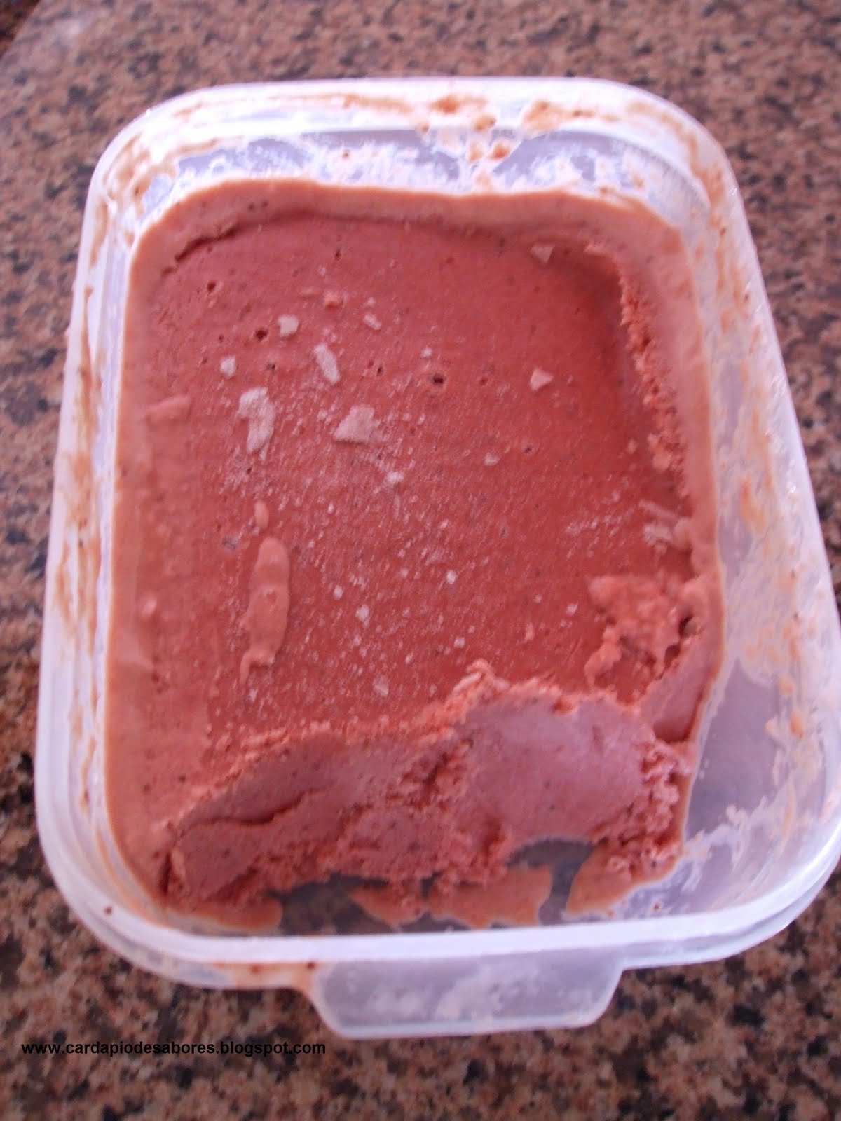 4. Coloca-se preparado numa caixa hermética e leva-se ao congelador. De hora a hora mistura-se com a batedeira, para não formar cristais de gelo.