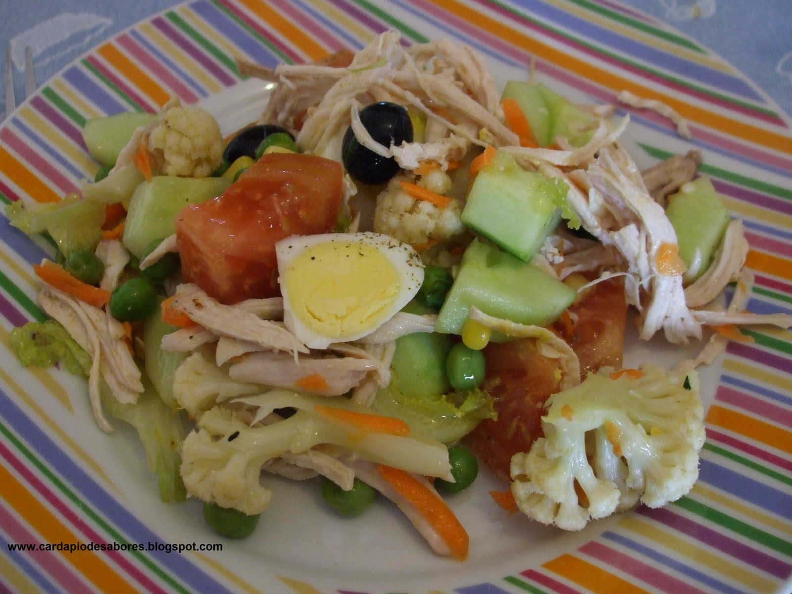 - Descasca-se o tomate, a cenoura e o pepino. Corta-se o tomate e o pepino aos cubos e rala-se a cenoura. Lavam-se folhas de alface e cortam-se em juliana. Junta-se á salada e acrescenta-se milho a gosto. Depois de as ervilhas e couve flor arrefecidas, juntam-se á salada e descascam-se os ovos e cortam-se ás fatias.