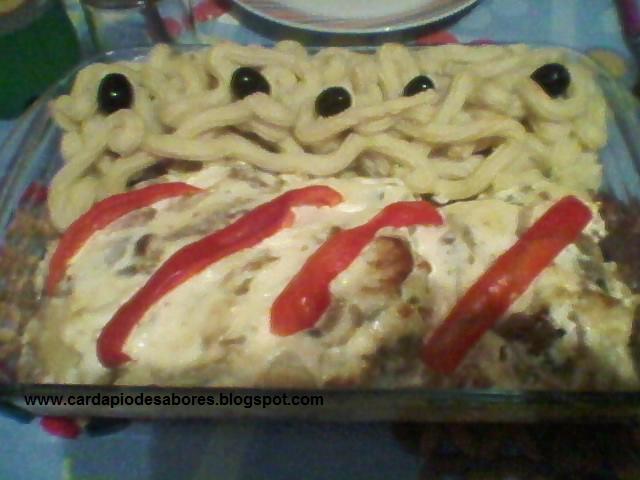 - Cubra o bacalhau com bastante maionese, decore com tiras de pimento e leve a gratinar a forno pré-aquecido a 210º, durante cerca de 30min.