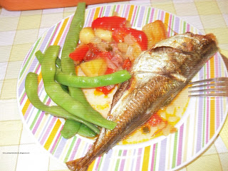 Ontem fiz uns carapaus assados no forno para o jantar. Como ainda ando numa de "despachar" os pimentos e tomates maduros que para ali andam, encontrei esta receita aqui e decidi experimentar. Com algumas alterações em quantidades e ingredientes, e gostei imenso.