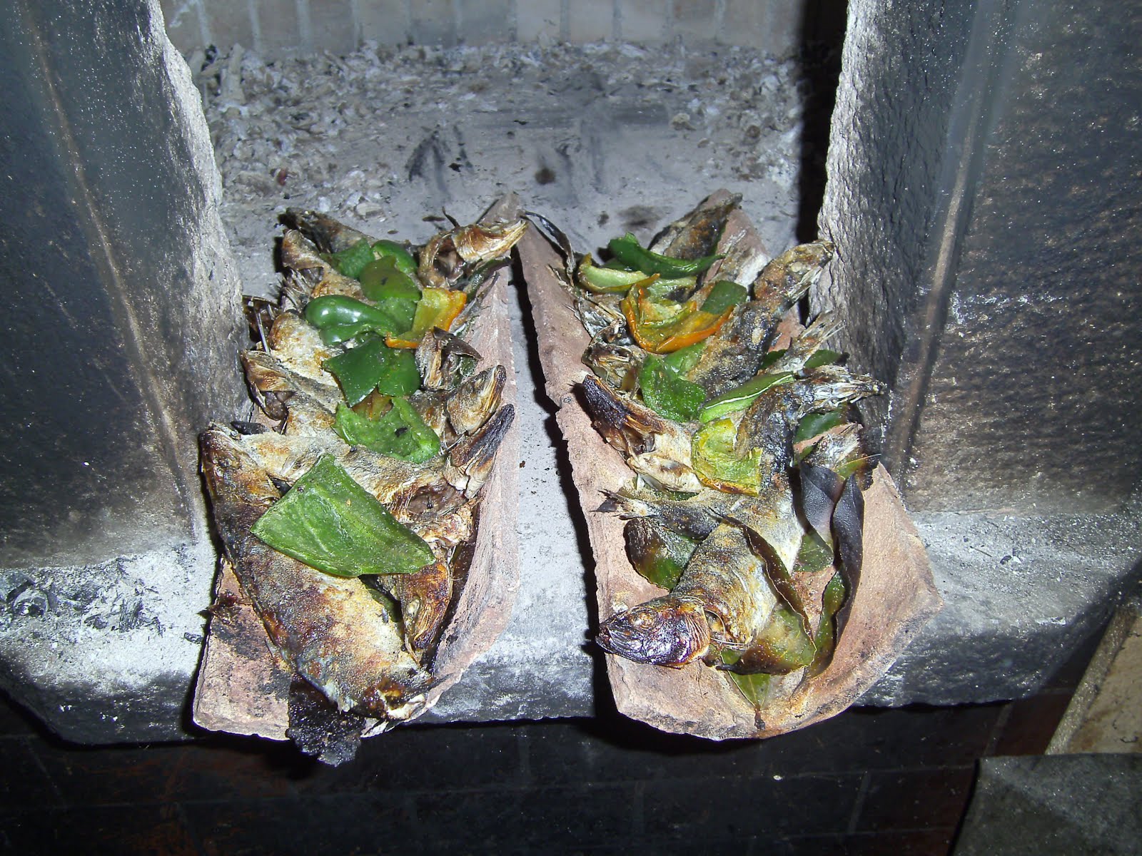 - Aquece-se o forno a lenha. Forram-se os fundos das telhas com folhas de louro. Por cima colocam-se as sardinhas, temperam-se de sal e piri-piri e deita-se um fio de azeite.